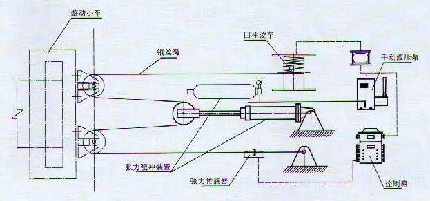 本裝置主要由基座、張緊絞車、液壓張力緩沖裝置、控制箱和張力傳感器五部分組成。圖示中的鋼絲繩由用戶提供,游動小車是皮帶機部件。張緊動作可根據需要實現變頻控制。